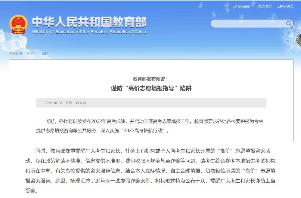 近日,教育部發(fā)布預警,提醒考生謹防“高價志愿填報指導”陷阱。有網站虛假宣傳擁有所謂“內部信息”,自稱掌握內部大數(shù)據(jù),能夠“精準定位院?!钡鹊取J聦嵣?,每年高考填報志愿前,各省級招生考試機構都會發(fā)布當年高考成績統(tǒng)計情況和近年來各高校錄取分數(shù)情況,并不存在市面上的咨詢機構或個人聲稱的“內部信息”。還有一些咨詢機構假冒所謂志愿填報專家身份。該咨詢機構打出廣告,稱團隊的專家“獲得高考志愿規(guī)劃師認證”“來自著名高校”等。事實上,有關部門從未發(fā)放過“高考志愿規(guī)劃師”這類職業(yè)資格證書。該機構一些所謂“志愿規(guī)劃師”都是臨時招募的社會人員,按照總部提供的“臺詞”給考生和家長輔導。家長購買這些機構的服務不僅花了冤枉錢,而且可能報錯志愿?! ?/p>