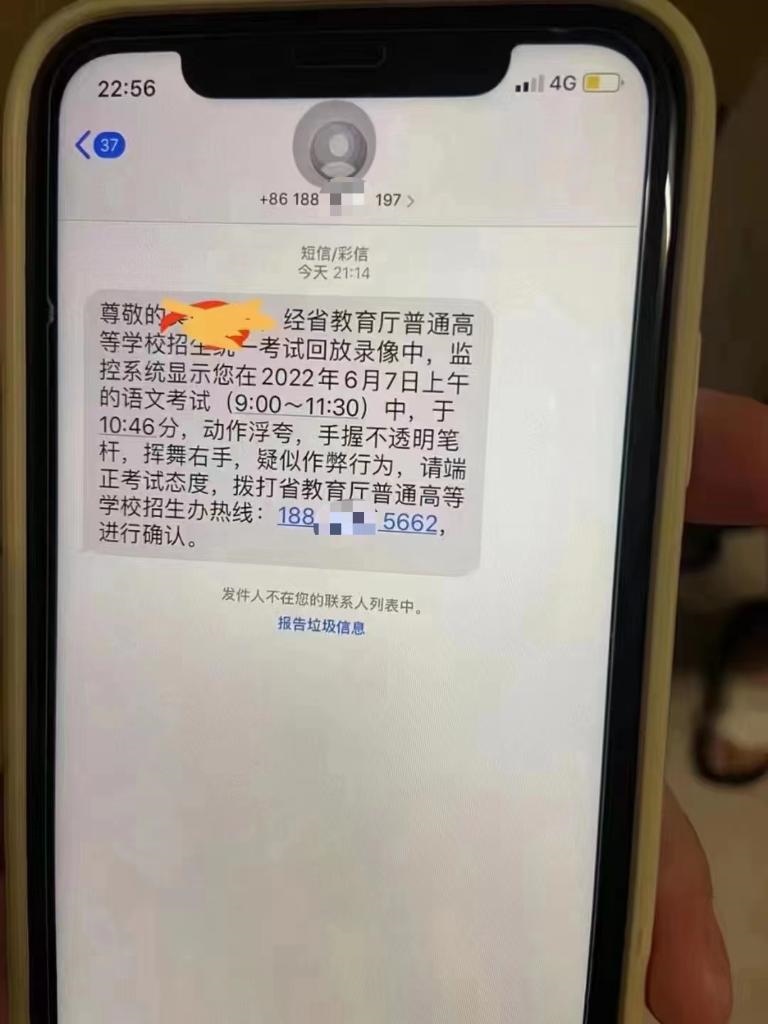 “尊敬的考生×××,經省教育廳普通高等學校招生統(tǒng)一考試回放錄像中,監(jiān)控系統(tǒng)顯示您在2022年6月7日上午的語文考試(9:00—11:30)中,于10時46分,動作浮夸,手握不透明筆桿,揮舞右手,疑似作弊行為,請端正考試態(tài)度,撥打省教育廳普通高等學校招生辦熱線:188×××進行確認?!苯眨锌忌驈B門警方反映,自己接到了聲稱是“省教育廳普通高等學校招生辦”的通知短信,懷疑是詐騙信息。該短信在開頭準確寫明了考生姓名,并在結尾要求考生主動撥電話號碼進行確認。經與教育部門核實確認,高考作弊違規(guī)行為不會以短信、電話、鏈接等方式通知。廈門警方提醒,不法分子通過非正常渠道搜集到考生信息,并向考生發(fā)送所謂“疑似作弊”的通知短信,考生一旦回撥電話,就可能被不法分子以“處理作弊行為”為由實施詐騙?! ?/p>