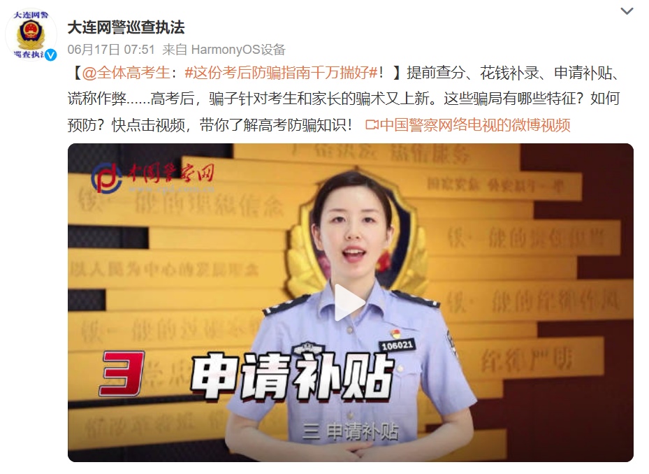 針對上述四種詐騙類型,廈門市打擊治理電信網絡新型違法犯罪中心民警洪恒亮表示,部分考生及家長“病急亂投醫(yī)”的焦慮心理和一些孩子希望盡早為家庭減輕經濟負擔的迫切需求使得上述精準詐騙得以有機可乘。不法分子通過看似專業(yè)的短信或電話通知,再輔以以假亂真的“證明材料”,具有一定的迷惑性。