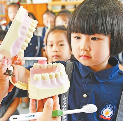 浙江省臺州市仙居縣迎暉幼兒園的小朋友正在學(xué)習(xí)正確的刷牙方法。 王華斌攝(人民視覺)
