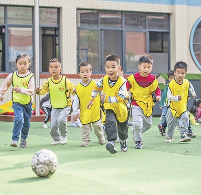湖南省永州市道縣城東幼兒園,孩子們在踢足球。 蔣克青攝(人民視覺)