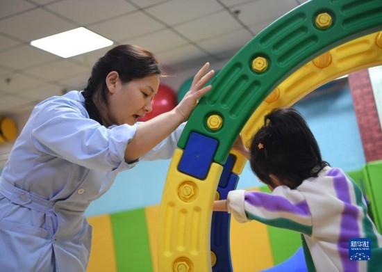 3月30日,在西安市金色陽光康復(fù)中心,特教老師為孩子進(jìn)行康復(fù)訓(xùn)練。