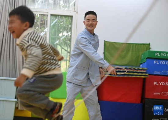 3月30日,在西安市金色陽光康復(fù)中心,特教老師(左)指導(dǎo)孩子進(jìn)行康復(fù)訓(xùn)練。