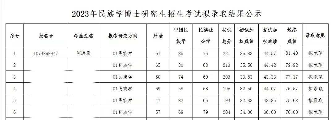 記者了解到,4月9日,青海民族大學研究生院官方網(wǎng)站發(fā)布《青海民族大學2023年民族學博士研究生招生考試擬錄取結(jié)果公示》。該公示稱,經(jīng)2023年青海民族大學博士招生工作領(lǐng)導小組審議通過,擬錄取17位考生為民族學博士研究生。根據(jù)公示,考生阿進錄以最終成績81.40分進入擬錄取名單,在民族學(報考研究方向)擬錄取的6名考生中排名第一。(李依環(huán)、實習生遇鏡霖)