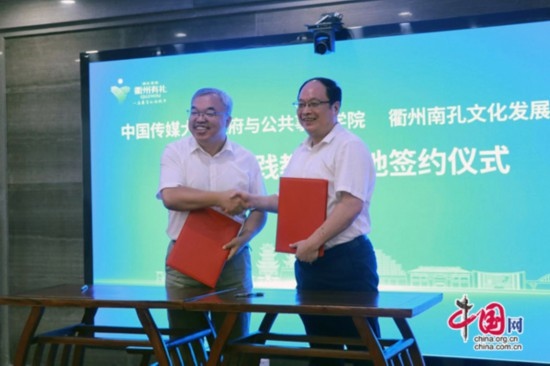 白文剛副院長與盛雄生主任分別代表中國傳媒大學政府與公共事務(wù)學院和衢州南孔文化發(fā)展中心簽署中國傳媒大學(政府與公共事務(wù)學院)實習實踐教學基地合作協(xié)議。