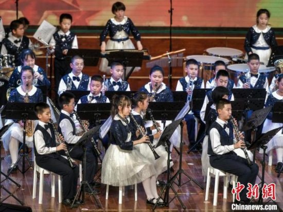 烏魯木齊市第27小學交響管樂團登臺獻藝。中新網(wǎng)記者 劉新 攝