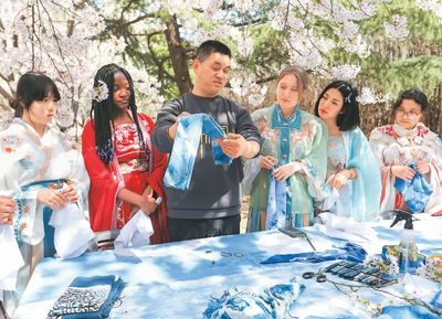 近日,江蘇海洋大學(xué)舉辦了一場別開生面的“藍(lán)染”體驗(yàn)課。課堂上,留學(xué)生們在專業(yè)老師的指導(dǎo)下,親手體驗(yàn)藍(lán)染技藝的神奇與美妙,感受中國傳統(tǒng)文化的獨(dú)特魅力。圖為老師給留學(xué)生們講解藍(lán)染技法。