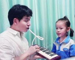 楊俊鑫向?qū)W生展示口風(fēng)琴的演奏方法。