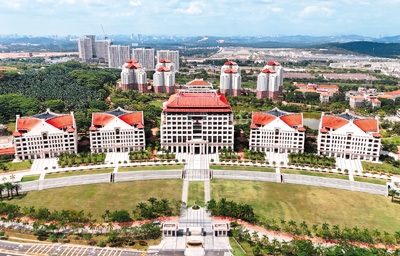 碧空悠悠,湖水如鏡。西洋風格搭配閩南傳統(tǒng)燕尾脊屋頂?shù)慕ㄖ溆谑[翠之中,陳嘉庚雕塑在晨光中投下長長的影子,學生們邁著輕快的步伐趕往教室。廈門大學馬來西亞分校(簡稱“廈大馬?!保┑那宄砍錆M生機。如今,這所高等學府成為中馬高等教育合作的旗艦項目。