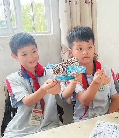 “這是航天衛(wèi)星的兩翼,是安裝太陽能電池板的地方?!眮碜詮V西壯族自治區(qū)梧州市藤縣第五小學(xué)的三年級學(xué)生李杰峰驕傲地展示著親手組裝的模型,他希望將來能從事航天工作。