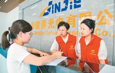 圖為近日,蒙山鎮(zhèn)黨員志愿者來(lái)到鏡界光電有限公司宣傳人才政策,指導(dǎo)企業(yè)申報(bào)相關(guān)人才項(xiàng)目。