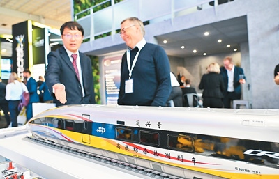 | 日前,在德國柏林軌道交通展上,中國鐵道科學(xué)研究院集團(tuán)有限公司工作人員(左)向參觀者介紹復(fù)興號(hào)高速綜合檢測列車模型。新華社發(fā) |