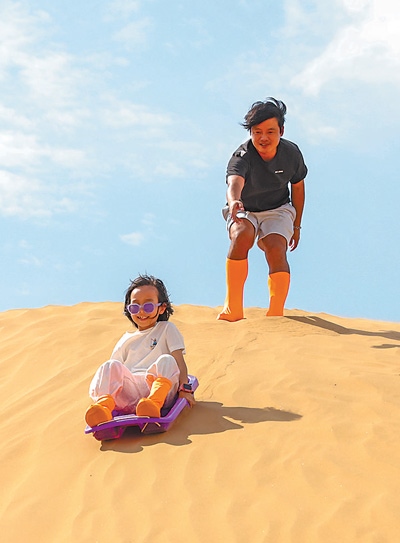 休閑運動小朋友在寧夏回族自治區(qū)中衛(wèi)市沙坡頭景區(qū)滑沙。 新華社記者 呂 帥攝