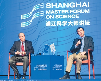 克萊因伯格(右)在復(fù)旦·浦江科學(xué)大師講壇活動中回答現(xiàn)場觀眾提出的問題。(資料圖)