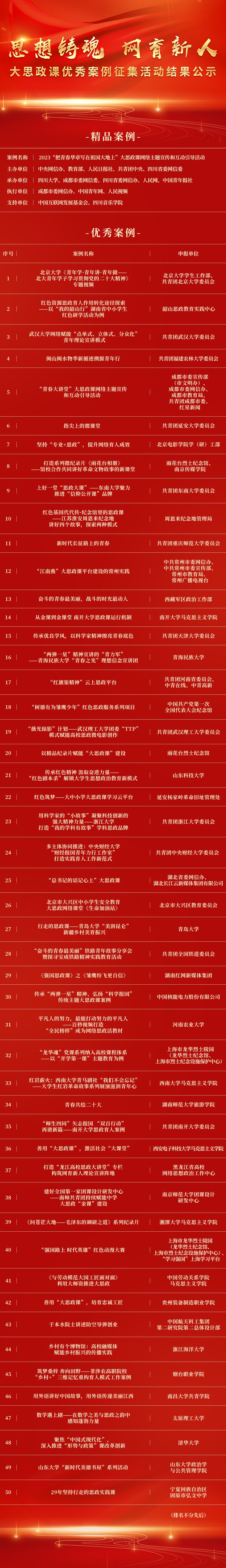 由中央網(wǎng)信辦網(wǎng)絡(luò)傳播局、共青團(tuán)中央宣傳部指導(dǎo),人民網(wǎng)、中國青年報(bào)社共同主辦的“思想鑄魂 網(wǎng)育新人”大思政課優(yōu)秀案例征集活動評選結(jié)果已經(jīng)產(chǎn)生,現(xiàn)對擬入選案例進(jìn)行公示,公示時(shí)間為1月20日至1月24日,公示期間歡迎社會各界監(jiān)督評議,有關(guān)意見可發(fā)送至郵箱eduyouth@163.com,我們將及時(shí)受理、認(rèn)真核查,公示期滿后將適時(shí)對外發(fā)布最終結(jié)果。