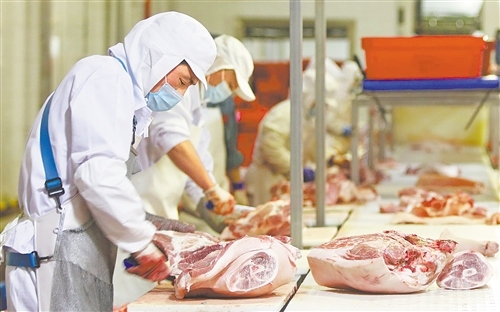 7月15日,北京二商肉類食品集團(tuán)有限公司員工在肉類分割流水線上工作。新華社記者 李欣 攝