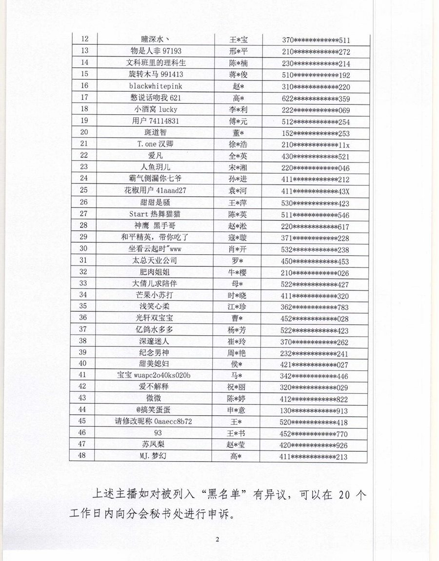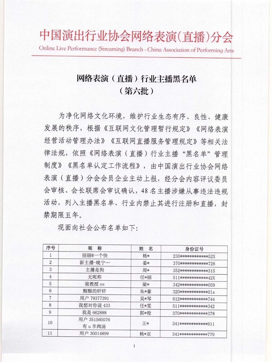 根據(jù)《互聯(lián)網文化管理暫行規(guī)定》《網絡表演經營活動管理辦法》《互聯(lián)網直播服務管理規(guī)定》等相關法律法規(guī),按照《網絡表演(直播)行業(yè)主播“黑名單”管理制度》《黑名單認定工作流程》規(guī)定,中國演出行業(yè)協(xié)會網絡表演(直播)分會現(xiàn)向社會公布第六批主播黑名單,被列入黑名單的主播將在行業(yè)內禁止注冊和直播,封禁期限5年。(總臺央視記者曹巖)