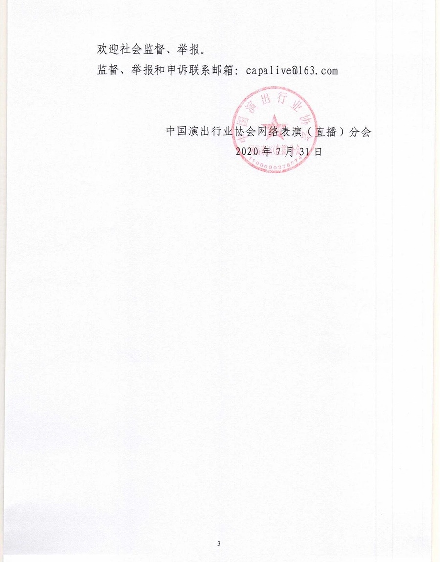 中國演出行業(yè)協(xié)會網絡表演(直播)分會8月9日發(fā)布: