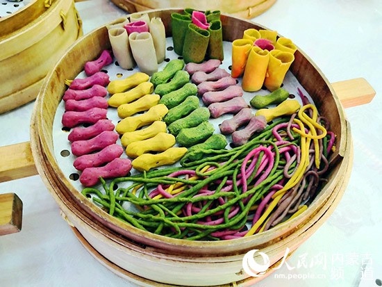 經(jīng)過(guò)蒸、烙、炒等多道工序,莜面魚(yú)魚(yú)、莜面窩窩、莜面卷卷出鍋上籠,散發(fā)著幽幽燕麥清香?!皞鹘y(tǒng)手藝也要?jiǎng)?chuàng)新,”莜面師傅袁俊平把菠菜、火龍果、金瓜、紫薯榨成果蔬汁和在面里?!拔宀瘦妗辈粌H增加了莜面的色澤,食客在品嘗時(shí)也能體驗(yàn)到不同果蔬的滋味。