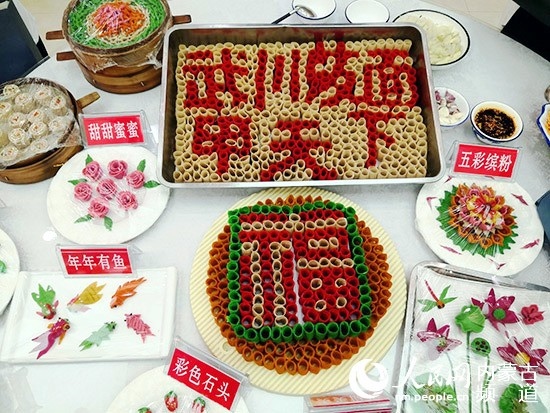 莜面師傅用五彩莜面拼寫(xiě)“武川莜面甲天下”字樣。陳立庚攝