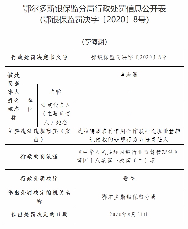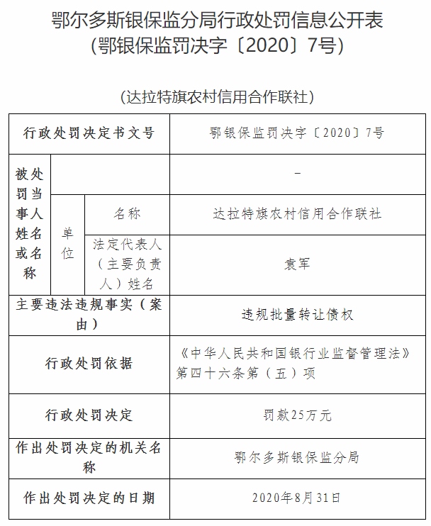 早在2019年11月26日,達拉特旗農(nóng)村信用合作聯(lián)社就曾因存在貸款“三查”制度落實不到位,貸款資金被挪用,被鄂爾多斯銀保監(jiān)分局罰款25萬元。據(jù)了解,達拉特旗農(nóng)村信用合作聯(lián)社因存在貸款“三查”制度落實不到位,貸款資金被挪用的違規(guī)事實,趙新明及楊東負直接責任。鄂爾多斯銀保監(jiān)分局根據(jù)相關(guān)規(guī)定,對達拉特旗農(nóng)村信用合作聯(lián)社罰款25萬元,對趙新明給予警告處分,楊東被罰終身禁業(yè)。
