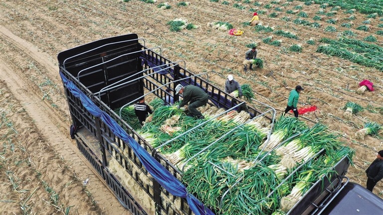 正在忙著收蔥打捆的村民于新穎說:“看這蔥長得多好!”
