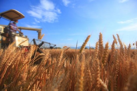 收割機在山東省臨沂市平邑縣的麥田里收割小麥(6月8日攝)。武紀全/攝(新華社發(fā))