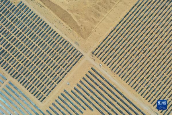 一匹占地130多萬平方米的沙漠“駿馬”橫臥在內蒙古自治區(qū)庫布其沙漠之中,這是位于達拉特光伏發(fā)電應用領跑基地中、由近20萬塊光伏板組成的“駿馬電站”。該電站采用“林光互補”模式,板上發(fā)電、板下種植,在開發(fā)利用庫布其沙漠豐富太陽能資源的同時,推動沙漠生態(tài)治理。