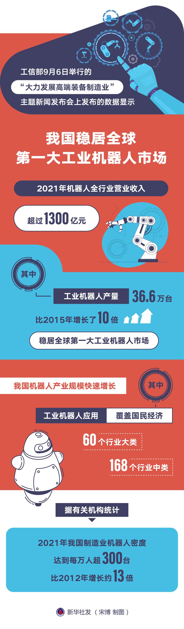 工信部裝備工業(yè)一司副司長郭守剛6日表示,我國機器人產(chǎn)業(yè)規(guī)??焖僭鲩L,2021年機器人全行業(yè)營業(yè)收入超過1300億元。其中,工業(yè)機器人產(chǎn)量達(dá)36.6萬臺,比2015年增長了10倍,穩(wěn)居全球第一大工業(yè)機器人市場。
