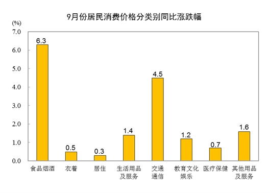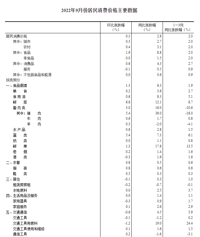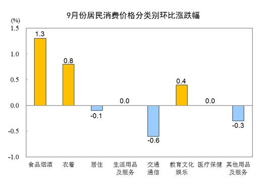 9月份,全國居民消費價格環(huán)比上漲0.3%。其中,城市上漲0.3%,農(nóng)村上漲0.4%;食品價格上漲1.9%,非食品價格持平;消費品價格上漲0.6%,服務(wù)價格下降0.1%。