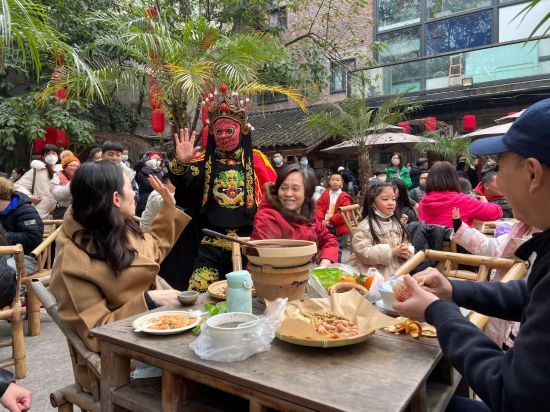 春節(jié)期間,重慶市渝中區(qū)山城巷中,“山城壩壩”茶館的院壩內(nèi)坐滿(mǎn)了客人。人們一邊圍爐煮茶,一邊欣賞臺(tái)上的傳統(tǒng)藝術(shù)表演,川劇變臉演員剎那間切換臉譜,贏得滿(mǎn)堂喝彩。老板舒蓉?zé)崆檎泻糁腿?,將茶水、點(diǎn)心端到桌上,忙得不亦樂(lè)乎?!敖衲甏汗?jié)的客流量遠(yuǎn)超預(yù)期,營(yíng)業(yè)額是去年同期的七八倍。”