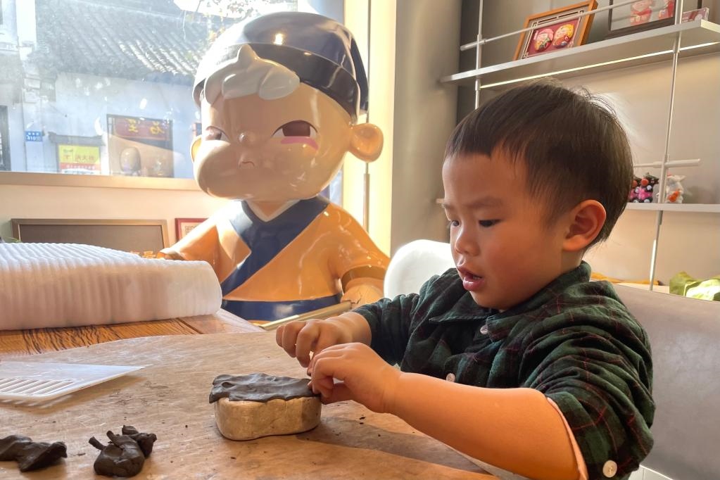 一名兒童在家長(zhǎng)陪同下在泥人咖啡館捏泥人。新華社記者 朱國(guó)亮 攝