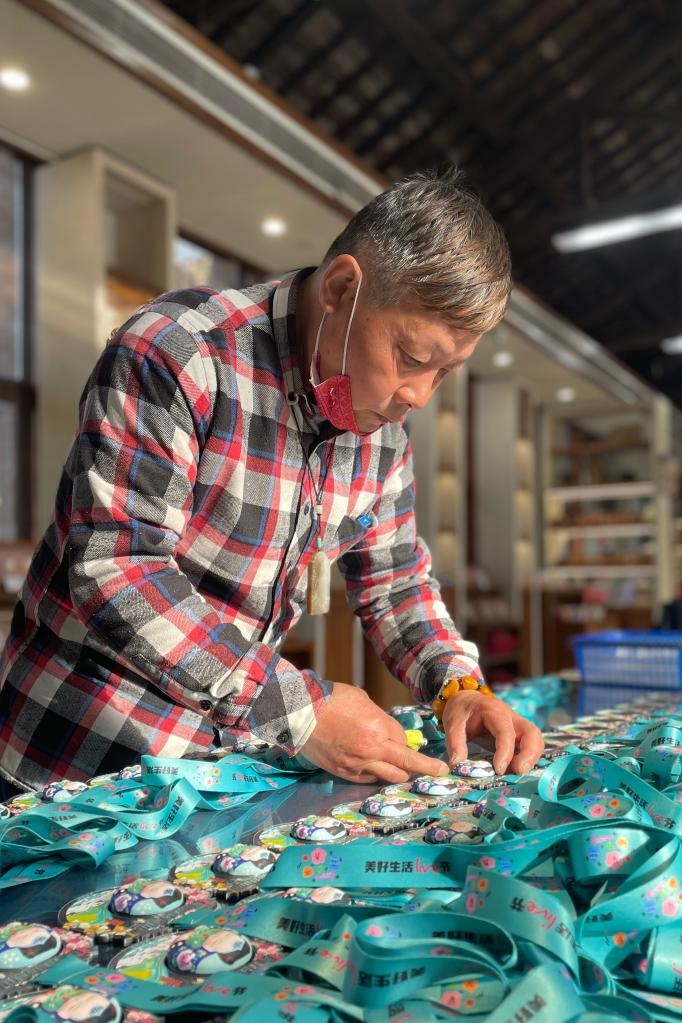 惠山泥人廠高級(jí)工藝美術(shù)師周漢慶在檢驗(yàn)登山節(jié)完賽獎(jiǎng)牌。新華社記者 朱國(guó)亮 攝