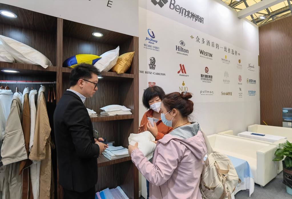 3月28日,觀眾在展會(huì)上詢問(wèn)布草用品。新華社記者 陳愛平 攝
