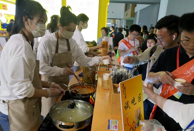 糖酒會上試吃區(qū)客商和觀眾排隊試吃產(chǎn)品。人民網(wǎng)記者 孫博洋攝