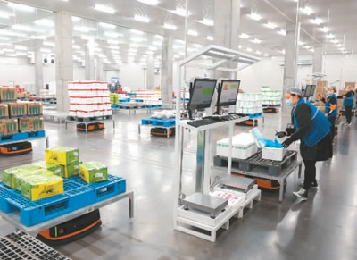 2月27日,在湖北省襄陽市好鄰居生鮮物流中心,機器人根據(jù)工作人員指令穿梭于貨架之間,自動分揀蔬菜、水果等生鮮產(chǎn)品。楊 東攝(人民視覺)