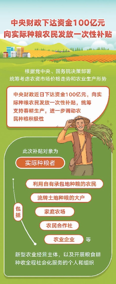 為此,國家統(tǒng)籌考慮農(nóng)資市場價格走勢和農(nóng)業(yè)生產(chǎn)形勢,中央財政向?qū)嶋H種糧農(nóng)民發(fā)放一次性補貼100億元,以穩(wěn)定農(nóng)民收入、保護農(nóng)民種糧積極性。