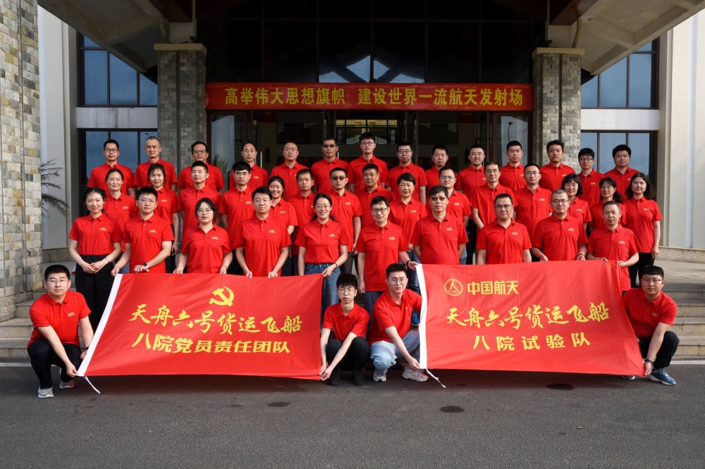 天舟六號貨運飛船八院試驗隊和天舟六號推進艙合影。(中國航天科技集團八院供圖)