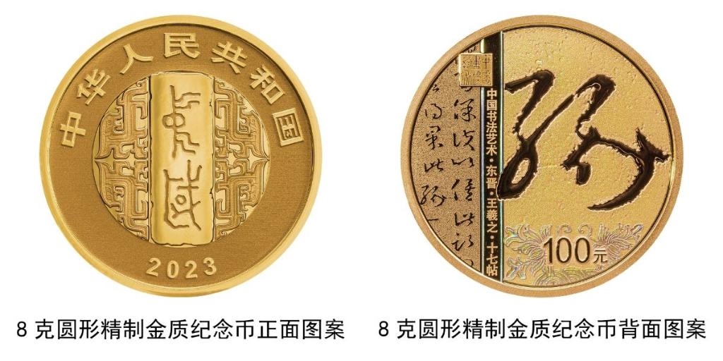 8克圓形金質(zhì)紀念幣背面圖案為東晉王羲之書《十七帖》局部文字及“緣”字樣與裝飾紋樣、“中國書法藝術”篆刻鈐印等組合設計,并刊“中國書法藝術·東晉·王羲之·十七帖”字樣及面額。