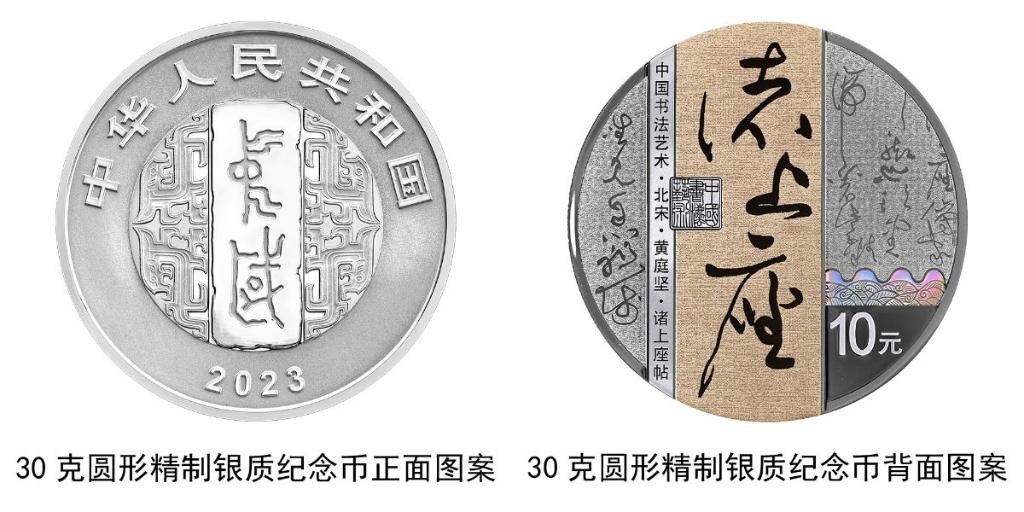 30克圓形銀質(zhì)紀念幣背面圖案為北宋黃庭堅書《諸上座帖》局部文字及“諸上座”字樣與筆架、“中國書法藝術”篆刻鈐印等組合設計,并刊“中國書法藝術·北宋·黃庭堅·諸上座帖”字樣及面額。