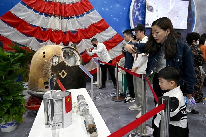 觀眾在安徽合肥舉辦的以“走向世界的中國(guó)航天”為主題的展覽上參觀嫦娥五號(hào)返回器等實(shí)物展品(2023年4月24日攝)。新華社記者 黃博涵 攝