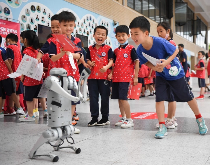 在湖南長(zhǎng)沙華夏實(shí)驗(yàn)學(xué)校舉辦“科技大篷車(chē)”進(jìn)校園活動(dòng)上,學(xué)生們?cè)诤蜋C(jī)器狗互動(dòng)(2022年6月22日攝)。新華社記者 薛宇舸 攝