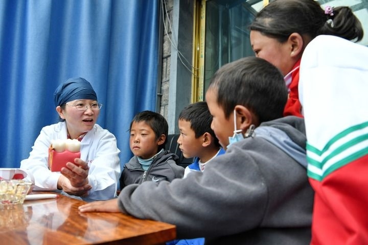 在西藏浪卡子縣普瑪江塘鄉(xiāng),上海市徐匯區(qū)牙病防治所的醫(yī)生蘇紅如向小朋友科普牙齒保健知識(shí)(2023年7月8日攝)。新華社記者 張汝鋒 攝