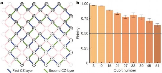 利用“祖沖之二號(hào)”完成的51比特一維簇態(tài)制備的線路及量子態(tài)保真度結(jié)果。(研究團(tuán)隊(duì)供圖)