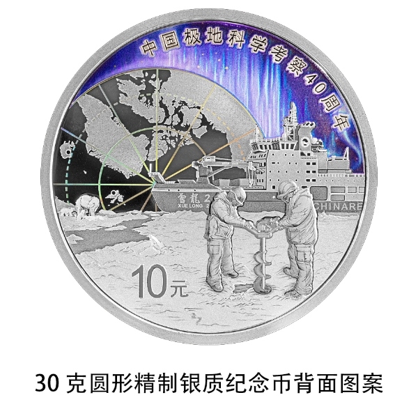 30克圓形銀質(zhì)紀(jì)念幣背面圖案為“雪龍2”號(hào)極地考察船、中國(guó)極地考察隊(duì)冰芯取樣工作場(chǎng)景、北極熊,輔以局部北極地圖輪廓及中國(guó)2座北極考察站點(diǎn)位、極光等組合設(shè)計(jì),并刊“中國(guó)極地科學(xué)考察40周年”字樣及面額。