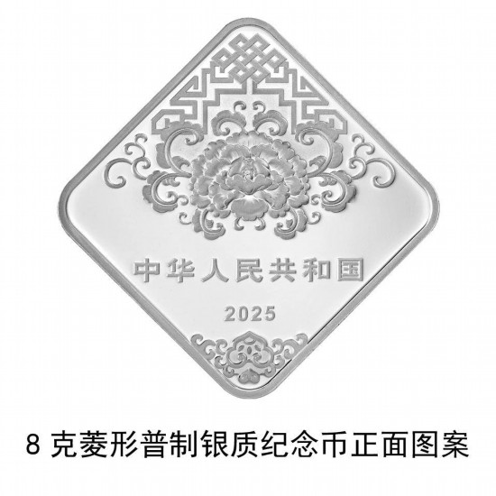 8克菱形銀質(zhì)紀(jì)念幣背面圖案為貼“?!弊謭?chǎng)景,并刊面額。