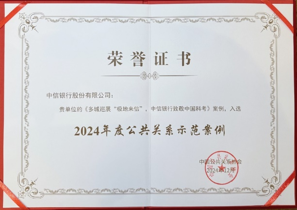 日前,2024年中國公共關(guān)系發(fā)展大會(huì)在北京舉辦,中信銀行“極地來信”整合品牌活動(dòng)通過多輪遴選,成功入選中國公共關(guān)系協(xié)會(huì)“2024年度公共關(guān)系示范案例”。