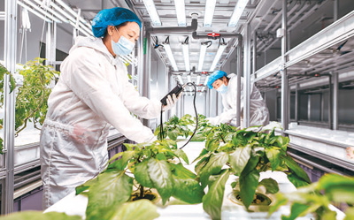 在呼和浩特市的內(nèi)蒙古宇生樂谷豐現(xiàn)代農(nóng)業(yè)產(chǎn)業(yè)園久和數(shù)智植物工廠,工人正進(jìn)行果蔬生產(chǎn)管理。