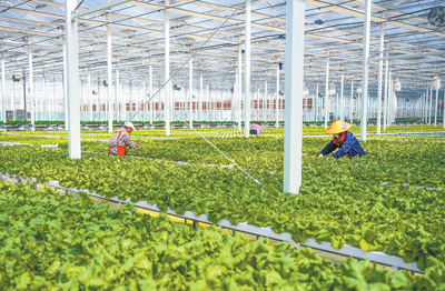 江蘇宿遷經(jīng)濟(jì)技術(shù)開發(fā)區(qū)南蔡數(shù)字農(nóng)業(yè)產(chǎn)業(yè)園溫室大棚里,村民在對(duì)蔬菜秧苗進(jìn)行管護(hù)作業(yè)。