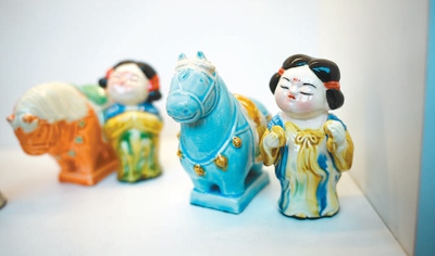 如今,唐三彩中常見的馬、駱駝等造型,形態(tài)更多元,顏色也更豐富。在洛陽“鎮(zhèn)搗蛋”等文創(chuàng)店,憨態(tài)可掬的三彩小馬除了傳統(tǒng)配色,還有粉色、水藍(lán)色等符合年輕人審美的莫蘭迪色系。三彩小馬、三彩侍女俑的文創(chuàng)組合,成為不少游客的到店選擇。